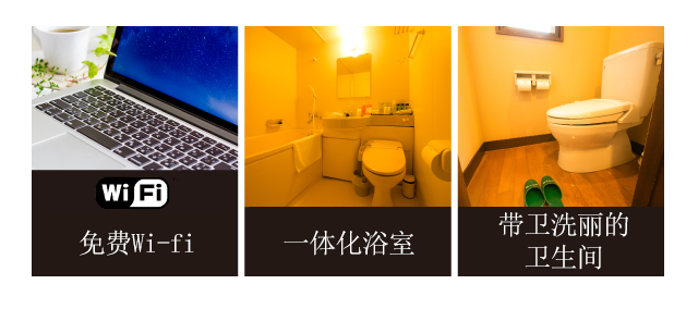 | Wi-Fi, 电视(免费VOD), 卫星播放, 免费, 电话, 茶具, 冰箱, 带清洗装置的卫生间, 固体, 液体, 洗发露(日西综合式客房), 护发素(日西综合式客房), 牙刷套装, 洗浴套装, 浴巾, 日式浴衣, 日式短袜, 保险柜 |