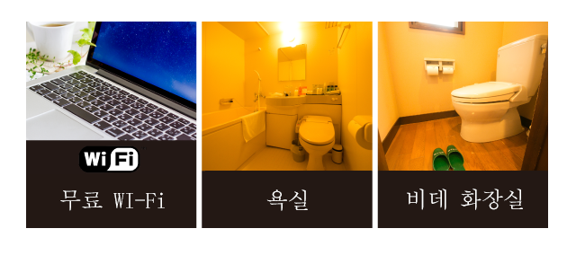 | Wi-Fi, 텔레비전(무료VOD), 위성 방송, 무료, 전화, 녹차 세트, 냉장고, 비데 화장실, 고형, 액체, 샴푸(일본식 양실), 컨디셔너(일본식 양실), 치약 세트, 목욕 세트, 목욕 타올, 유카타, 일본식 버선, 금고 |